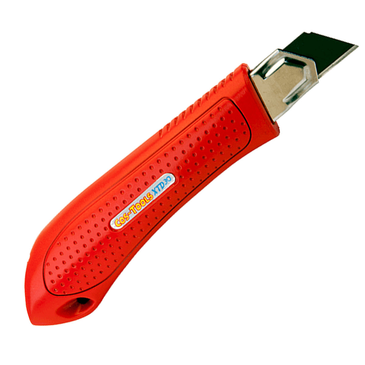 Handheld adjustable depth utility knife with snap off blade and solid locking mechanism for consistent depth settings.  Used to size suitable cosplay materials.  Must have scrap foam-board under material as underlayment.
