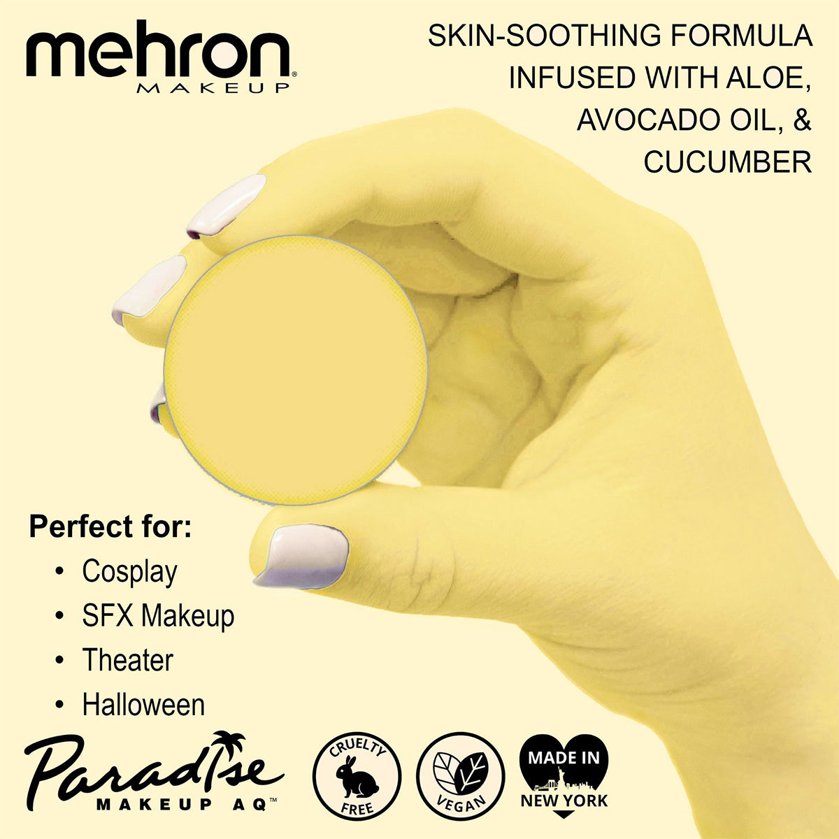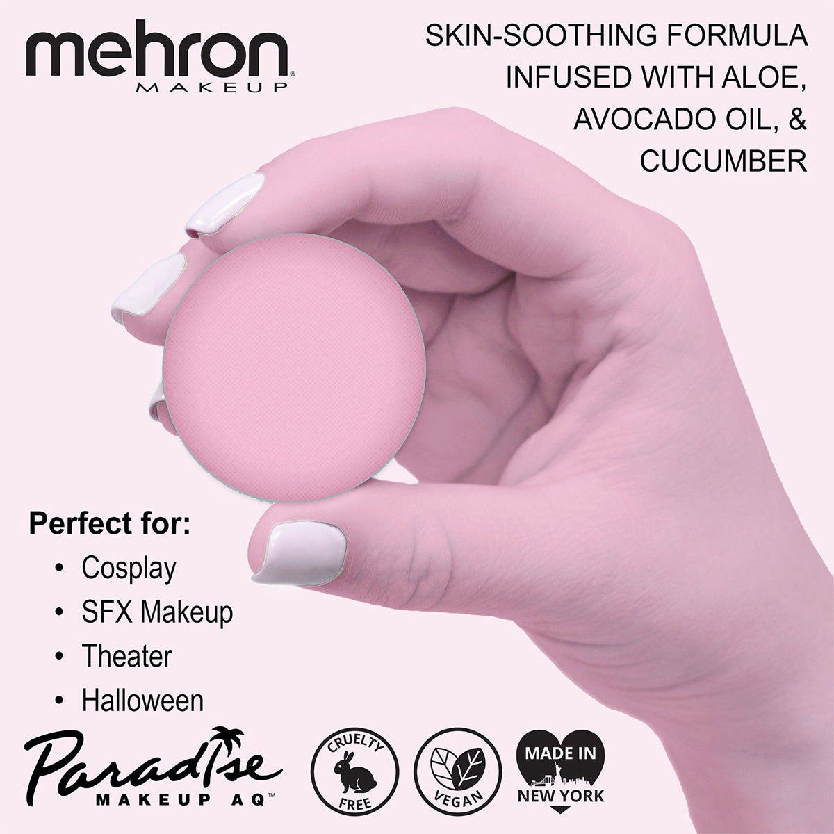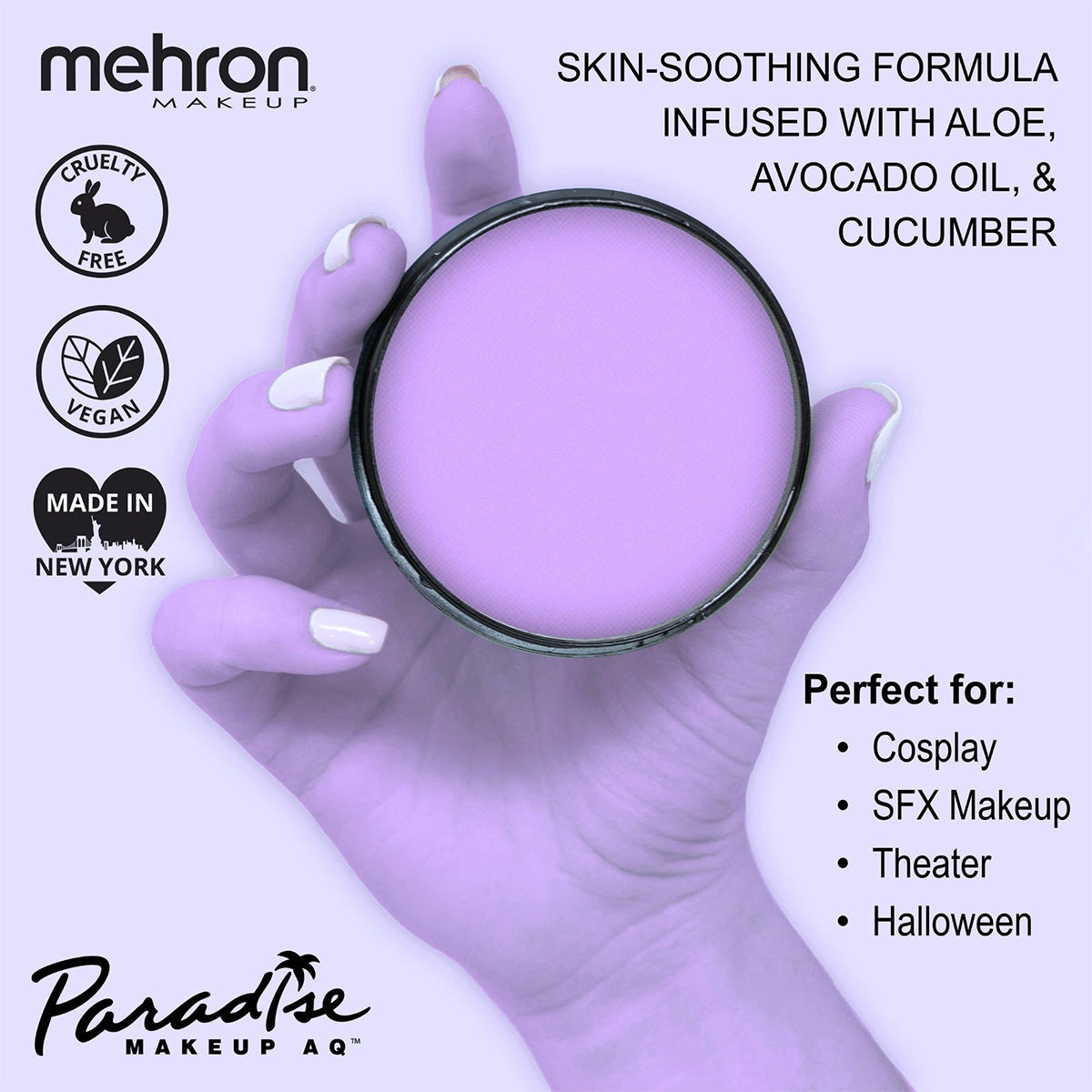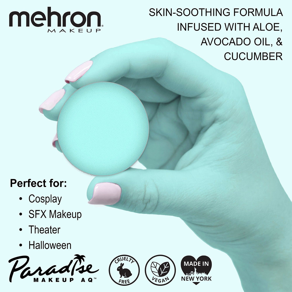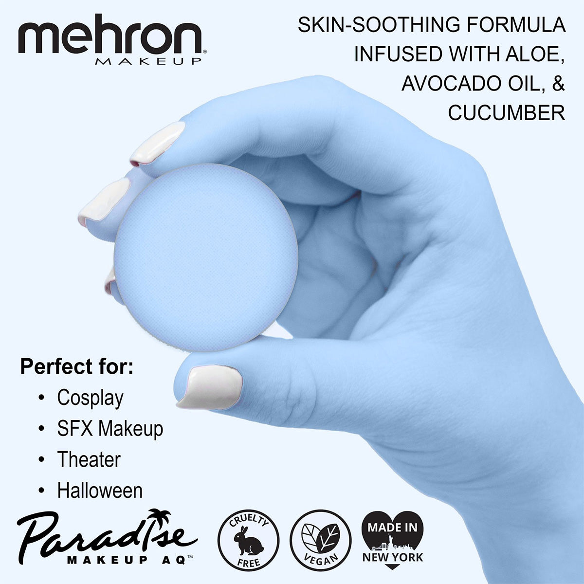 As with all Paradise paints, these are infused with skin soothing ingredients like Aloe, Avocado Oil, Cucumber, Lemongrass, and Cocoa Seed Butter. Mehron Paradise is made in the USA and is FDA & EU Compliant. As always, Mehron Paradise is Vegan, Cruelty Free, Paraben Free, and Gluten Free. For best results, wet your applicator and swirl it on the surface of the cake to create a creamy consistency before applying. Available in 0.25oz Refill Size and 1.4oz Pro Size as individual colors or you can get all the colors in an 8 Color All Inclusive Palette.